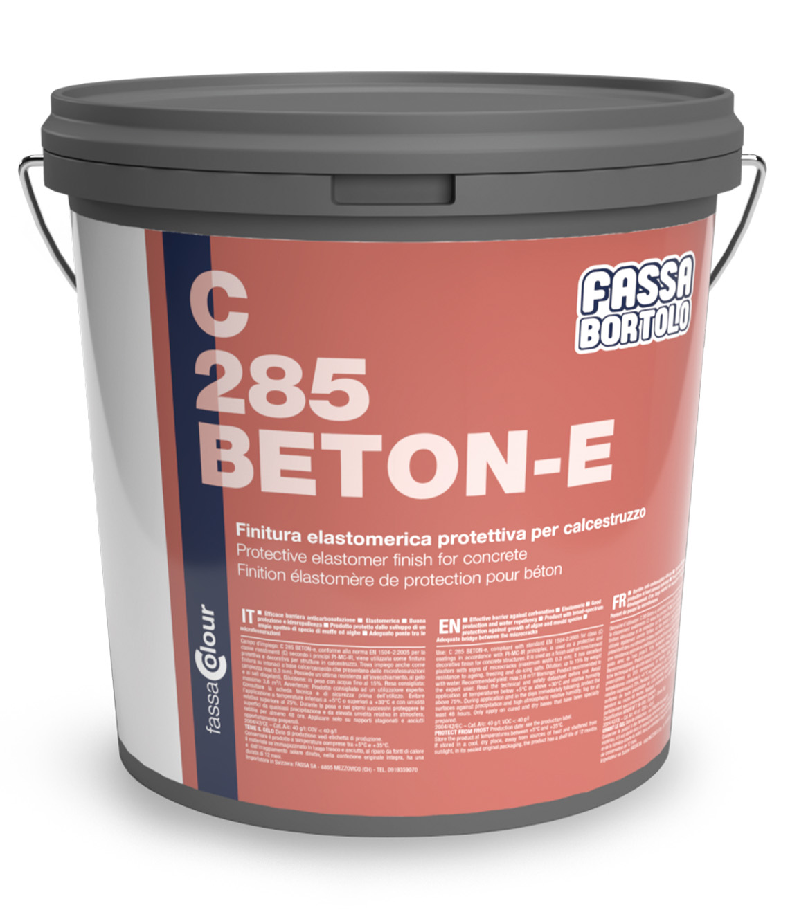 C 285 BETON-E é uma tinta monocomponente à base de água, que cria um filme na superfície mediante a luz natural, utilizada como acabamento de proteção e decoração em estruturas de betão, protegendo-as da carbonatação ou como acabamento em rebocos à base de cal/cimento que apresentam microfissuras (amplitude máxima de 0,3 mm). C 285 BETON-E, depois de seca, possui uma ótima resistência ao envelhecimento, ao gelo e sais descongelantes; está conforme a EN 1504-2:2005 (sistema de proteção de superfícies de betão) para a classe de revestimentos (C) segundo os princípios 1.3 (proteção contra os riscos de penetração, PI), 2.2 (controlo da humidade, MC), 8.2 (aumento da resistividade, IR) critério de conformidade sistema 2+, anexo ZA.2.